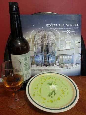 The suggested wine pairing by Celebrity is a light Manzanilla, a Fino sherry from Jerez, Spain. Sherry is a fortified wine and Manzanilla is the driest and palest of all the different varieties. Any good liquor store will carry sherry; choose one from Spain and you can’t go wrong. DO NOT substitute with a ‘cooking sherry’ – these are of poor quality and are NOT meant for drinking! Of course, since I’m Spanish, I just HAPPENED to have this lovely sherry already in my bar and the pairing was sublime. The Manzanilla’s fresh, delicate flavor complimented the light, almost grassy quality of the cucumbers and the tanginess of the yogurt superbly. This lovely herb-laced soup, along with the sherry, is the perfect choice for the first course of your next summer dinner party. Enjoy!