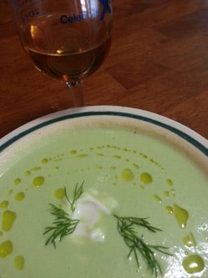 The suggested wine pairing by Celebrity is a light Manzanilla, a Fino sherry from Jerez, Spain. Sherry is a fortified wine and Manzanilla is the driest and palest of all the different varieties. Any good liquor store will carry sherry; choose one from Spain and you can’t go wrong. DO NOT substitute with a ‘cooking sherry’ – these are of poor quality and are NOT meant for drinking! Of course, since I’m Spanish, I just HAPPENED to have this lovely sherry already in my bar and the pairing was sublime. The Manzanilla’s fresh, delicate flavor complimented the light, almost grassy quality of the cucumbers and the tanginess of the yogurt superbly. This lovely herb-laced soup, along with the sherry, is the perfect choice for the first course of your next summer dinner party. Enjoy!